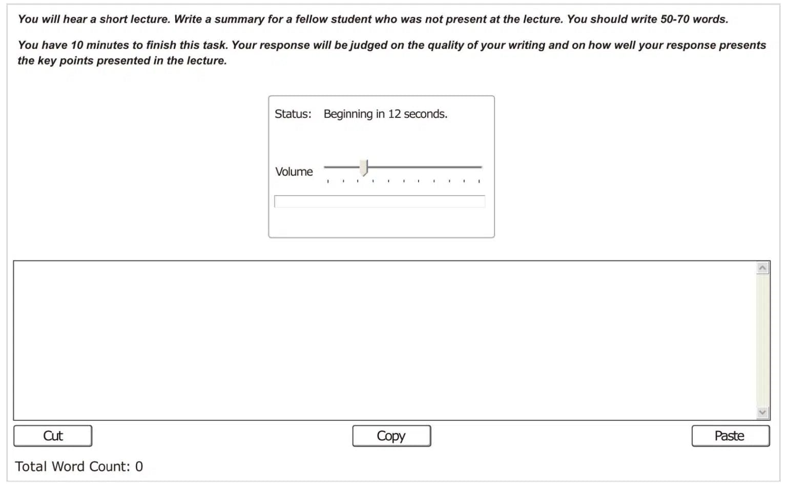 در این بخش برای شما یک لکچر پخش می شود که باید بعد از اتمام لکچر شما خلاصه آن را با 50-70 کلمه یادداشت کنید. این تسک بسیار تکنیک محور می باشد و نیازمند تسلط بر مهارت نت برداری در زمان پخش فایل صوتی است. پس از اتمام لکچر شما باید کلمات کلیدی که از فایل صوتی یادداشت کرده اید را در داخل یک متن از پیش ساخته شده ( تمپلیت) قرار دهید.