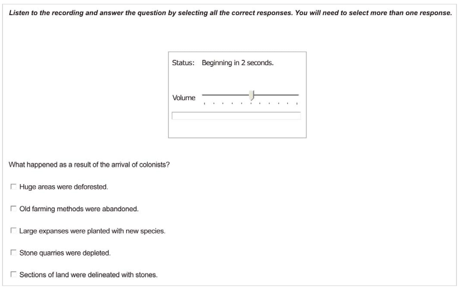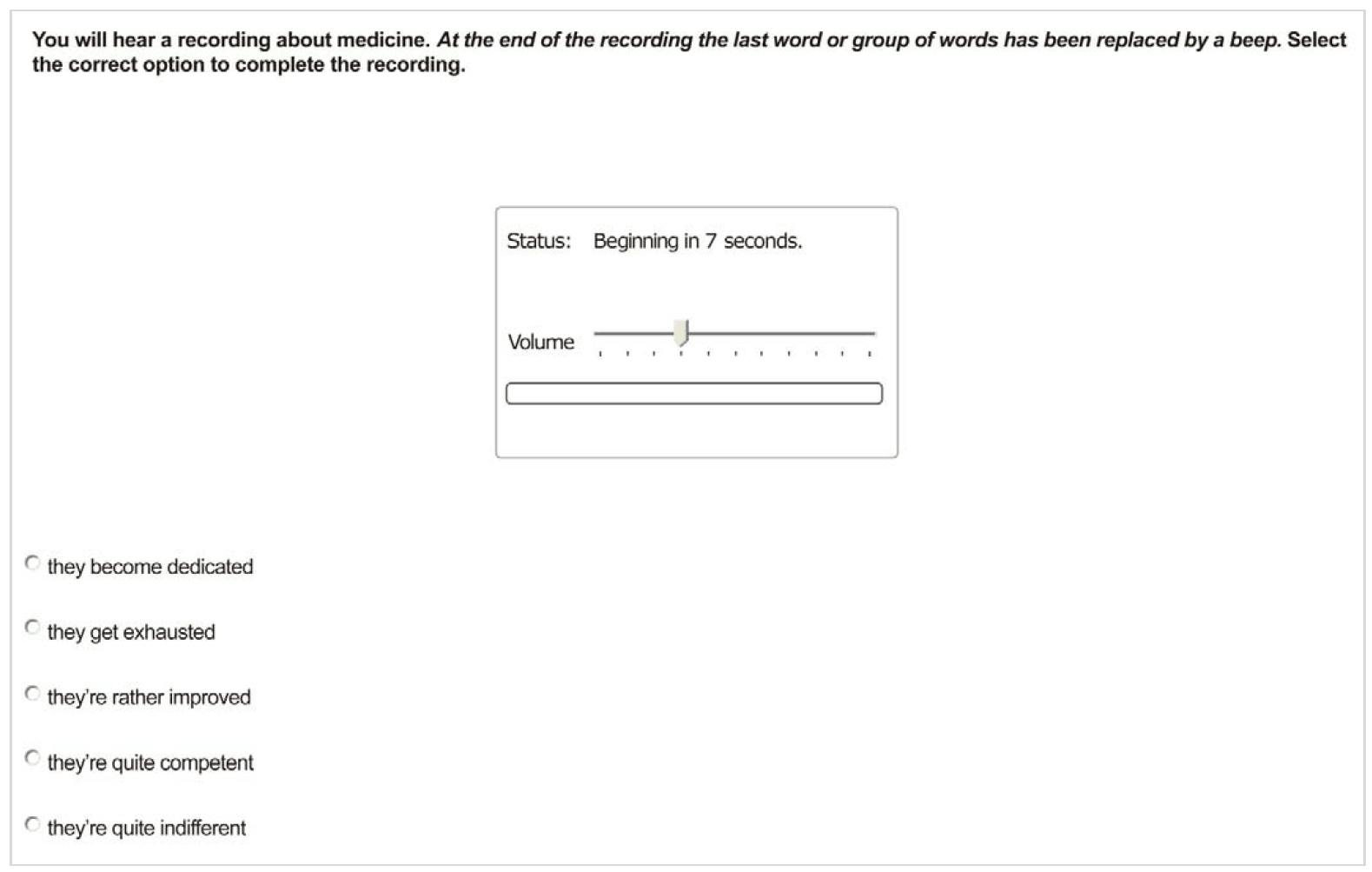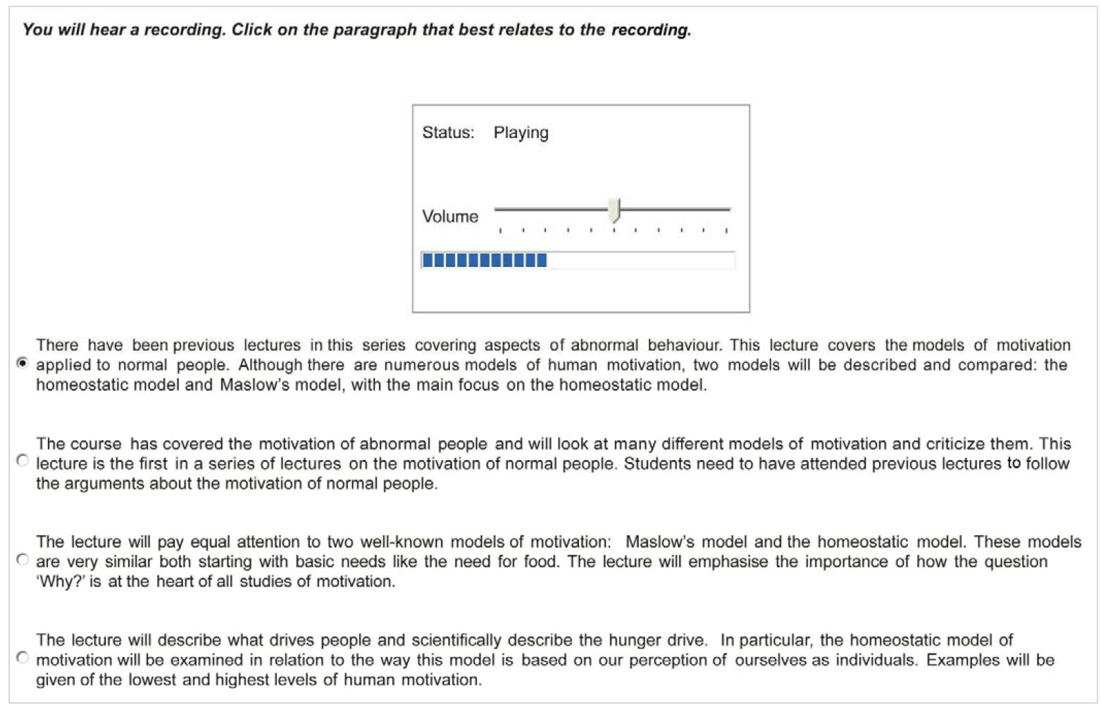 در این بخش یک لکچر برای ما پخش می شود. در پایین فایل صوتی چند گزینه به نسبت طولانی وجود دارد. ما باید گزینه ای را انتخاب کنیم که بهترین خلاصه (summary ) برای لکچر پخش شده باشد.
