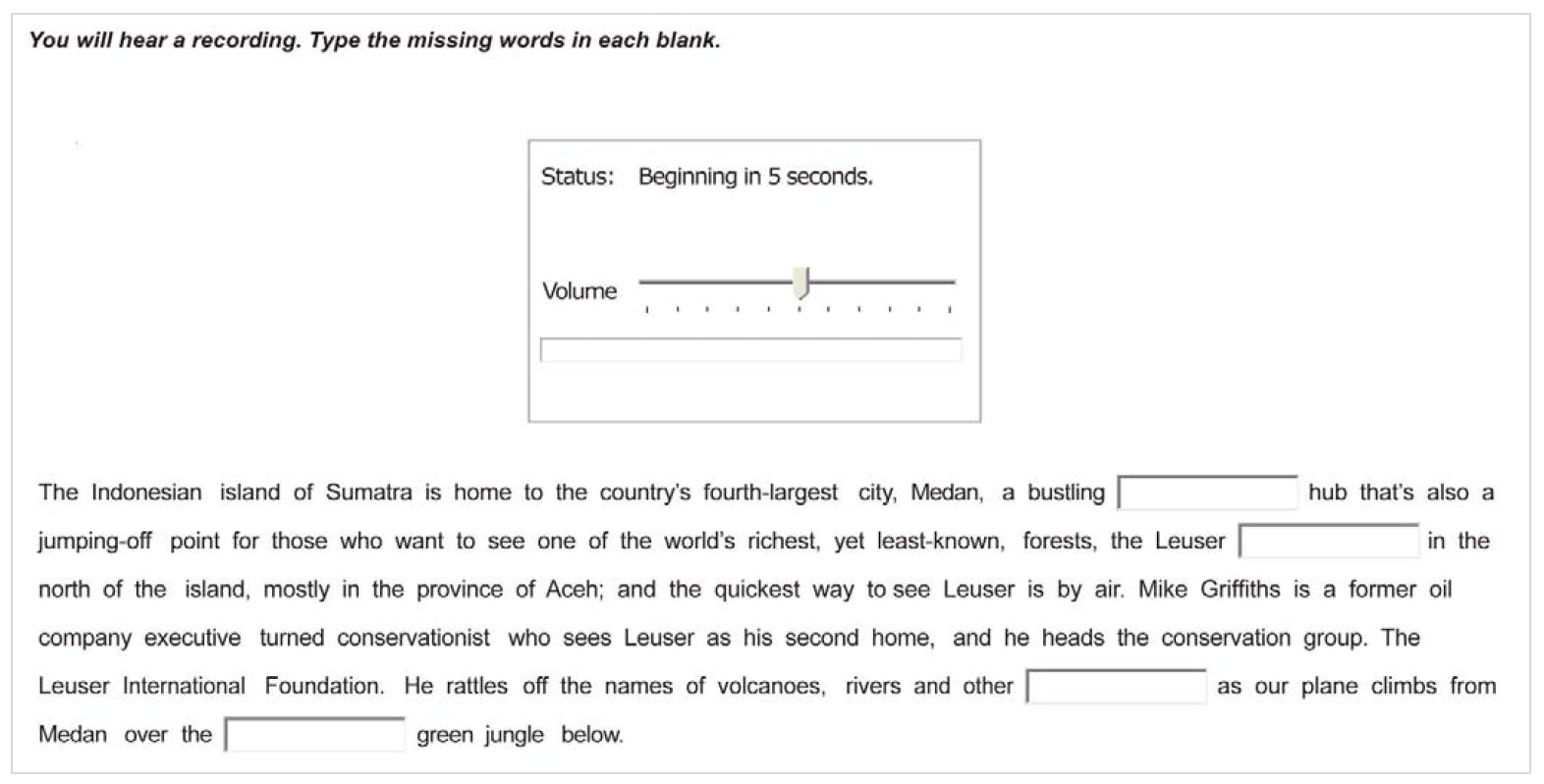 در این بخش یک متن با چندین جای خالی داریم که باید جاهای خالی رو با توجه به فایل صوتی پر کنیم. در واقع فایل صوتی دقیقا همان متن را می خواند که باید کلمه جا افتاده را دقیقا تشخیص بدهیم و یادداشت کنیم.
