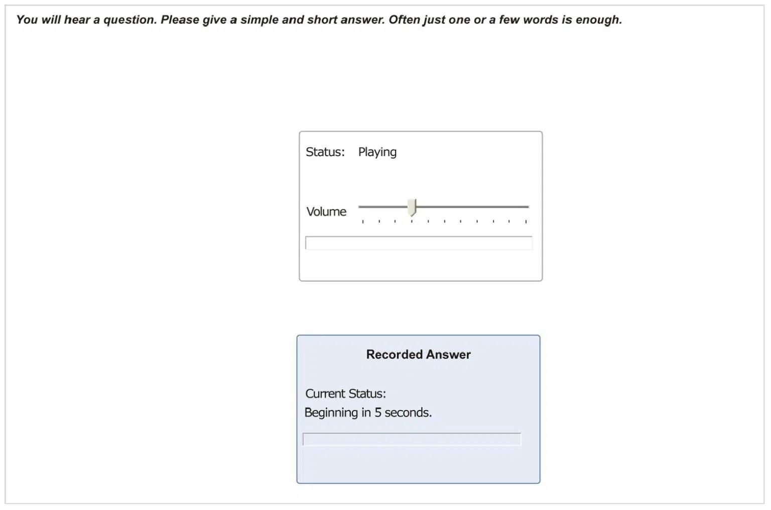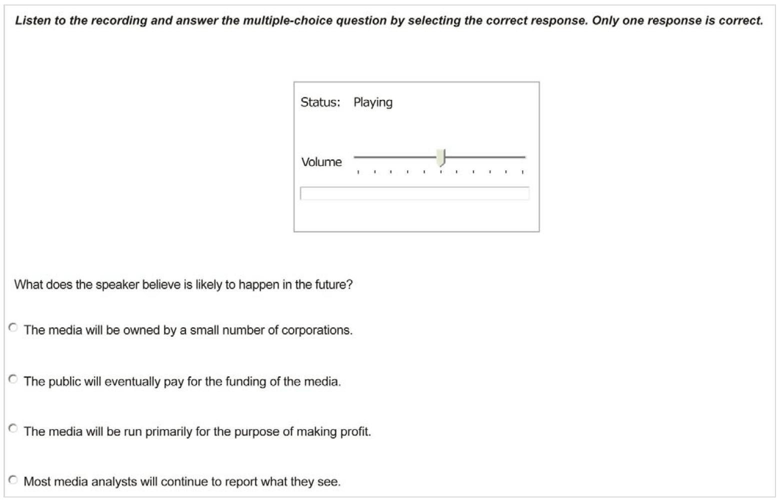 این بخش دقیقا مشابه تسک دوم لیسنینگ آزمون PTE هست. با این تفاوت که فقط یک گزینه درست به عنوان پاسخ سوال زیر فایل صوتی قرار دارد.