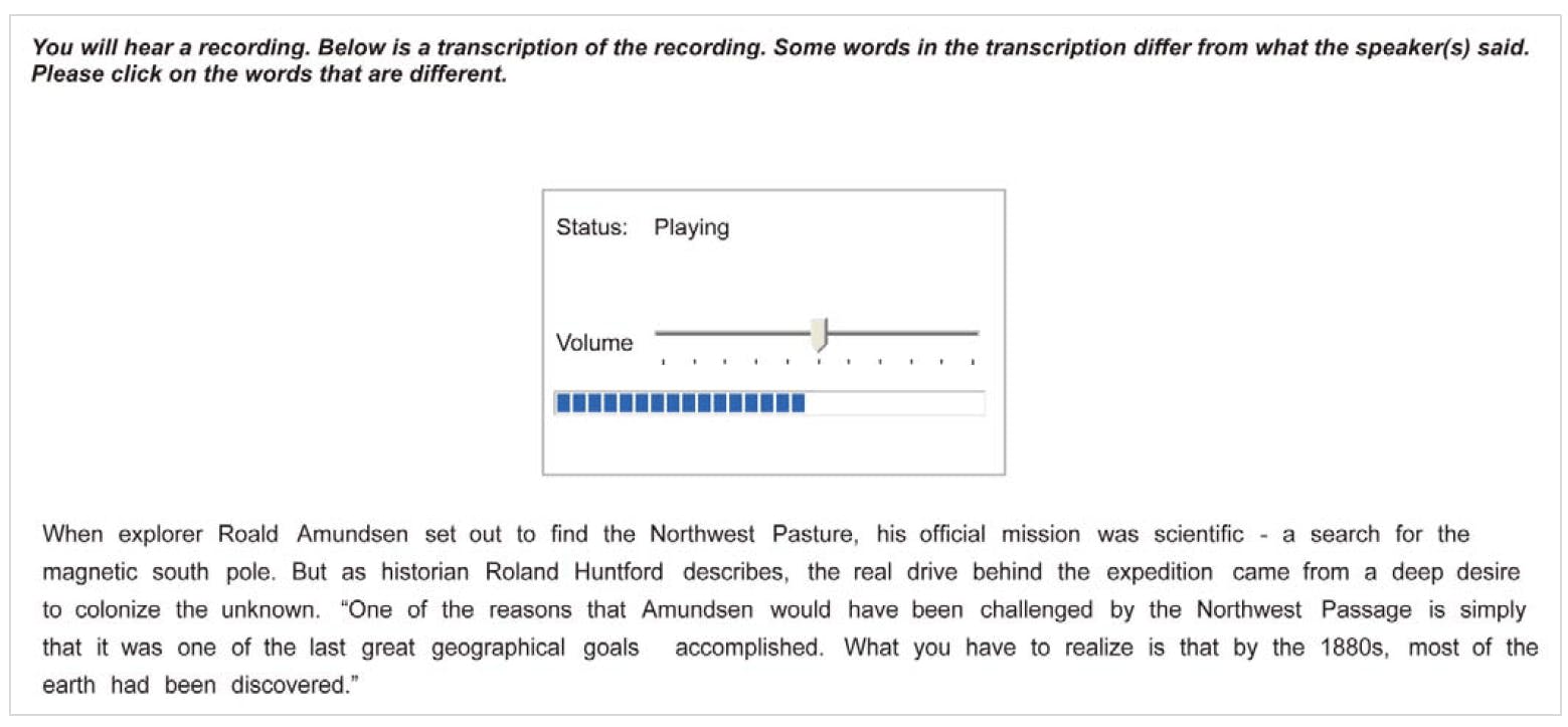 این بخش از لیسنینگ PTE بسیار ساده می باشد. که البته نمره به نسبت خوبی هم برای ریدینگ و لیسنینگ به ما می دهد. در این بخش یک متن وجود دارد که گوینده از روی متن برای ما روخوانی می کند. هر کلمه ای از متن را که متفاوت گفت باید روی آن کلمه کلیک کنیم. در واقعا کلمه نادرست را هایلایت کنیم.