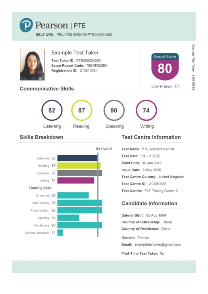نمونه ای از کارنامه این امتحان در زیر آورده شده است. همانطور که مشاهده می کنید کارنامه این امتحان علاوه بر نتیجه 4 مهارت اصلی، نتایج دقیق تری در قالب enabling skills به شما ارائه می دهد که این خود یکی از مزایای اصلی امتحان پی تی ای می باشد.